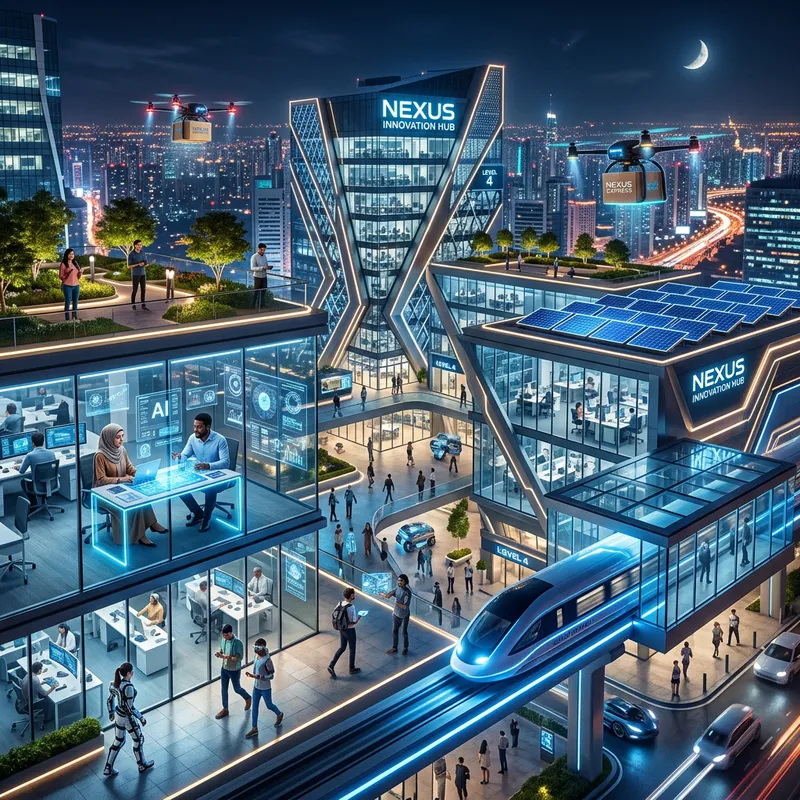 A contemporary visualization of a futuristic company. High-tech buildings characterized by modern architecture with lots of glass and geometry. Drones hovering around for delivery, high-speed magnetic trains in and out of the complex, and people with various technological gadgets. Workstations are equipped with holographic computers and AI-assisted interfaces. Men and women of varied descents like Caucasian, Hispanic, Black, Middle-Eastern, and South Asian work harmoniously in this advanced environment. Rooftop gardens and solar panels add a sustainable touch to this futuristic corporation. Nighttime scene with vibrant city lights in the background.