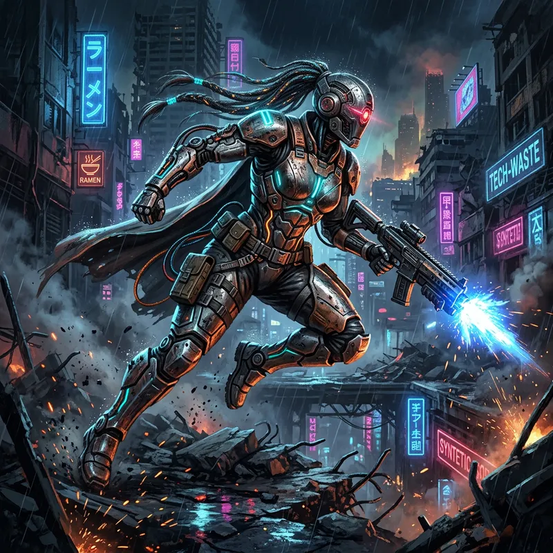 Futuristic Cyborg Warrior in Cyberpunk Setting