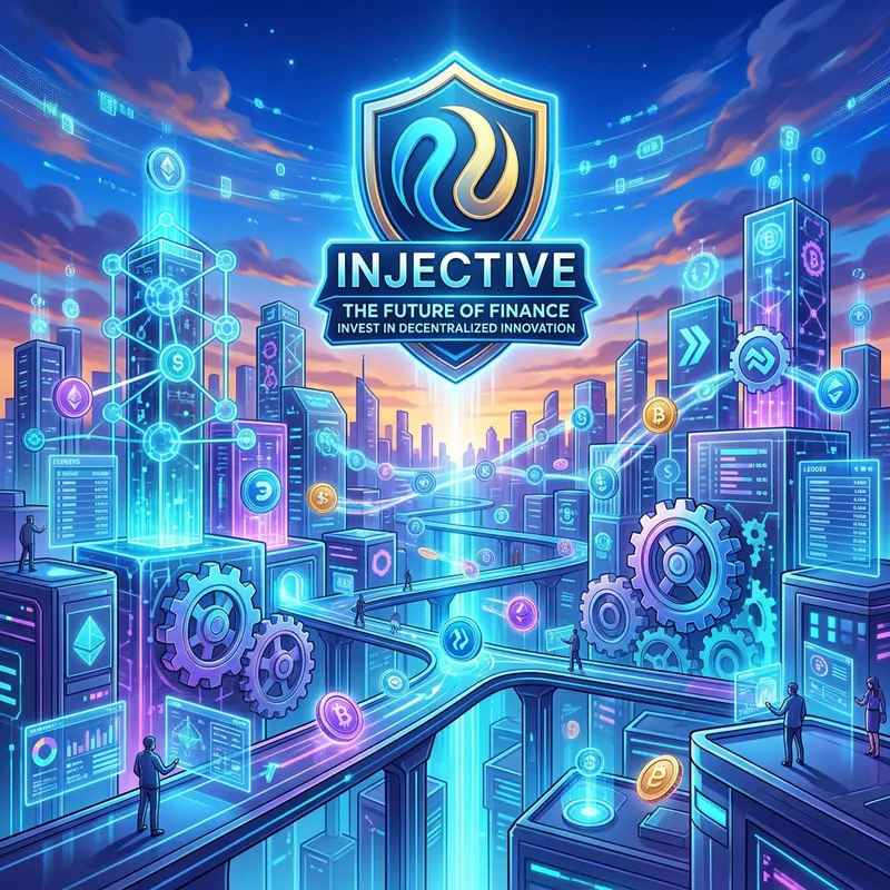 A visual representation depicting the concept of Decentralized Finance as the future of finance. Include a metaphorical image of a futuristic financial landscape with digital coins, gears, and futuristic buildings symbolizing blockchains and smart contracts. Also, include an emblem or banner that encourages investing in 'Injective', a word that doesn't convey any specific real-world entity. The aesthetic is vibrant, digital and progressive.