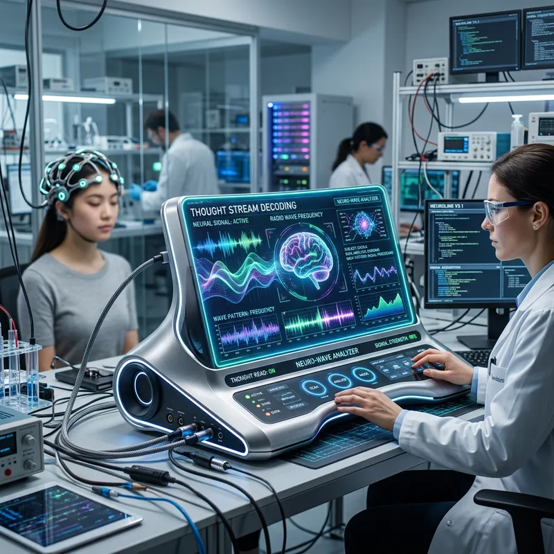 futuristic device designed for reading human thoughts, utilizing radio wave technology, sleek design, advanced display with wave patterns, glowing elements, metallic finish, high-tech interface, set in a modern laboratory, a blend of science fiction and cutting-edge technology.