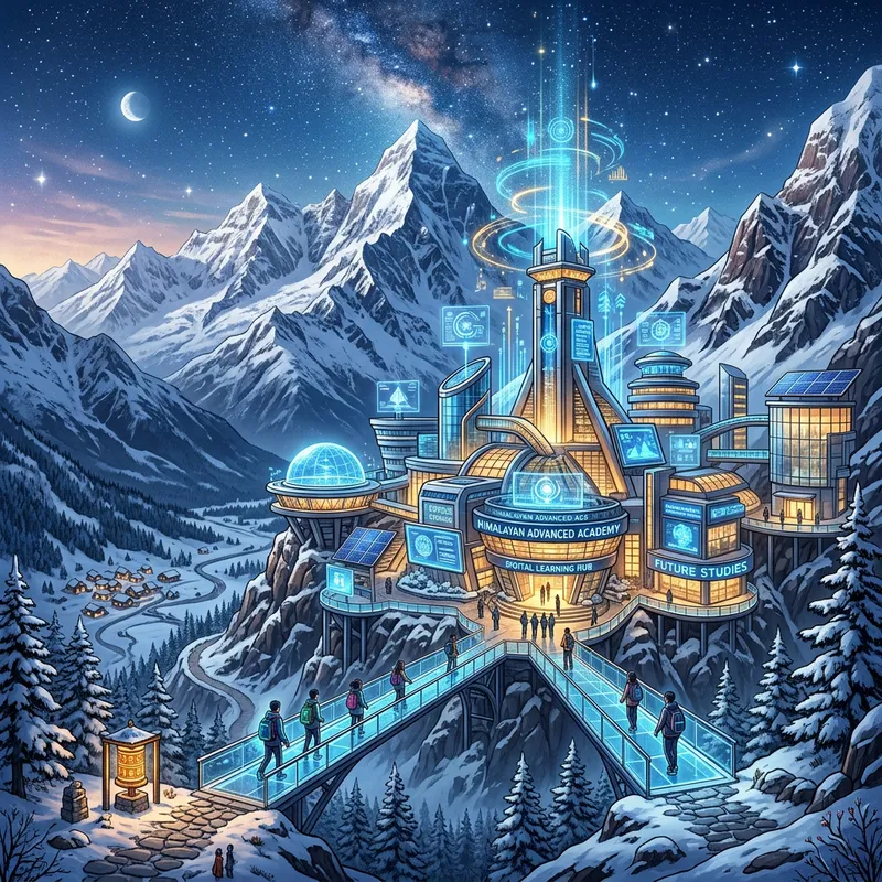 Digital illustration of a futuristic educational institution nestled amidst the towering snow-capped peaks of the Himalayan mountains. This high-tech school glows with lights that indicate its digital interface, promoting an atmosphere of advanced learning. The building perfectly integrates into the rugged terrain, with the high peaks forming an imposing backdrop. Technology and nature seamlessly blend in this scenery, with transmitting digital signals competing with the pristine echoes of the mountains. The sky overhead is a calming twilight blue, dotted with twinkling stars.
