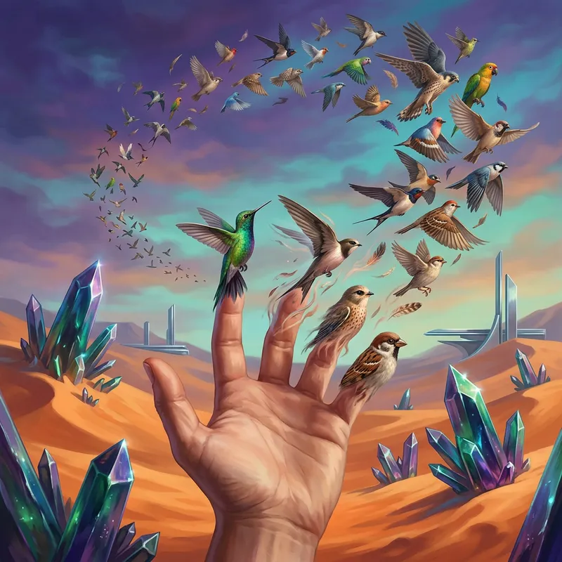Visualize an intricate and captivating scene, where a human hand in the foreground begins to morph, the flesh transforming into feathered creatures in mid-transition. Each finger gradually gives rise to individual birds which take to the sky, creating a grand spectacle of various birds in full flight. The backdrop of this surrealist portrayal features a desert landscape, not from the pages of history but a vision of the future. Picture an expanse filled with shimmering, colorful crystals erupting from the sandy ground, their forms stark against the ever-changing desert sky. Let the ambiance evoke a sense of wonder and the endless possibilities of evolution.