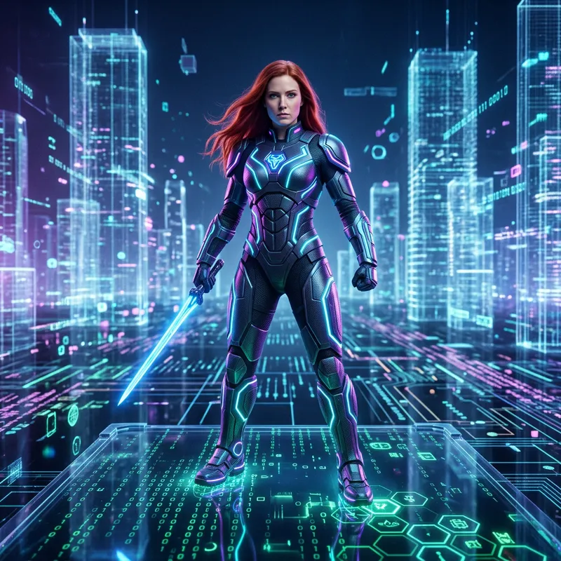 A heroic female figure with an attractive physique in a metaverse setting. She is Caucasian, has flowing red hair, and is wearing futuristic armor that glows with neon lights. Around her are digital landscapes with tall holographic buildings and floating data streams. She stands firm on a virtual platform that shines with coded symbols as she prepares to protect this digital world from any threats.