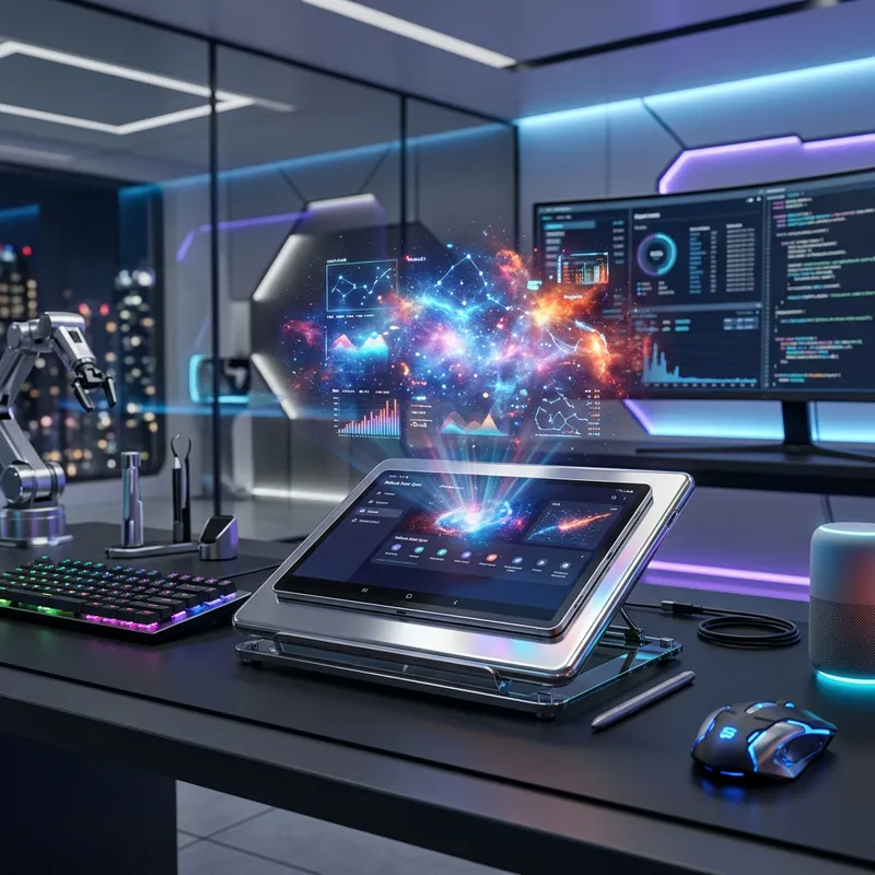 A cutting-edge Galaxy Tab S7 resting on a sleek, hi-tech workstation. The tablet displays holographic data, radiating brilliant colors akin to Nebulae in outer space. It's encased in a shiny metallic cover, reflecting the light around it. An air of futuristic sophistication is captured by sleek lines, advanced technology, and innovative design elements. Everything is set against a backdrop of a clean, contemporary room, filled with sharp angles, minimalist decor, and latest gadgets. Glowing LED lights from the room's futuristic tech tools illuminate the scene.