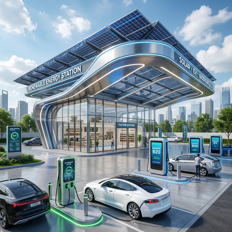 A futuristic gas station design imbued with modern architecture. The station features sleek lines, gleaming metal, and integrated lightening. Touchscreens replace the traditional pumps, and solar panels can be seen on the roof, emphasizing the concept of renewable energy. Electric vehicle charging ports are available, alongside biodiesel pumps for hybrid vehicles, and the station store bears a minimalistic style with transparent glass walls.