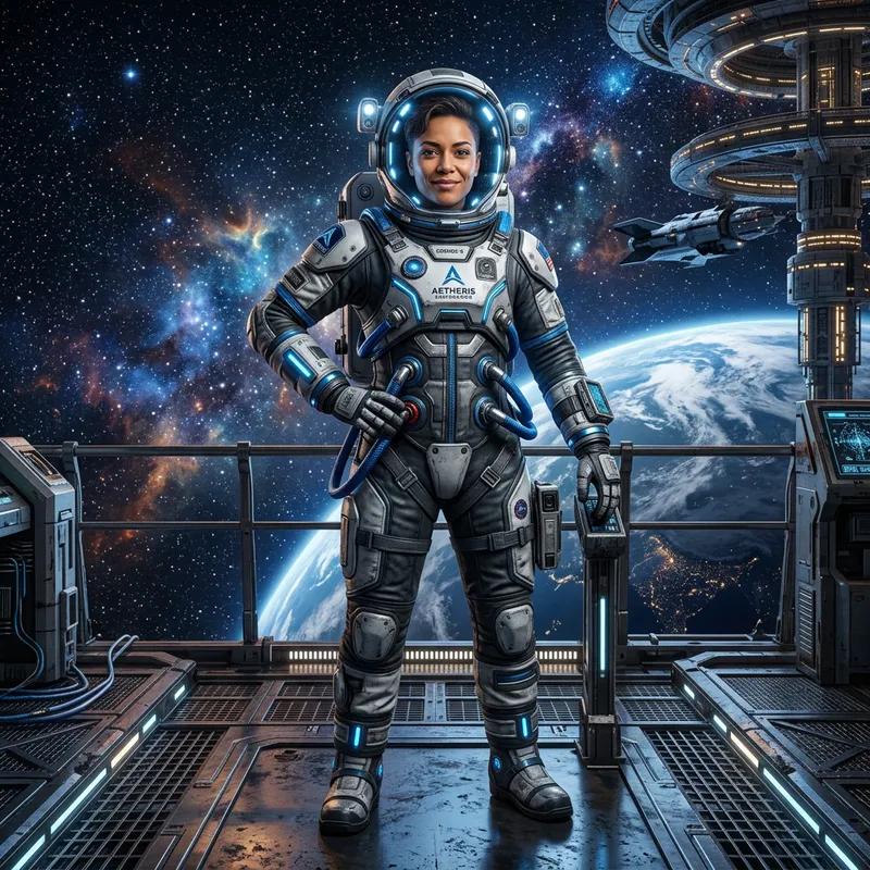 A futuristic high-tech individual of non-specified descent, posing confidently in a space suit against a backdrop of stars. The scene is captured with the precision of a high-resolution digital camera, boasting vibrant colors and crisp details. The overall tone and setting draw heavy influence from science fiction.