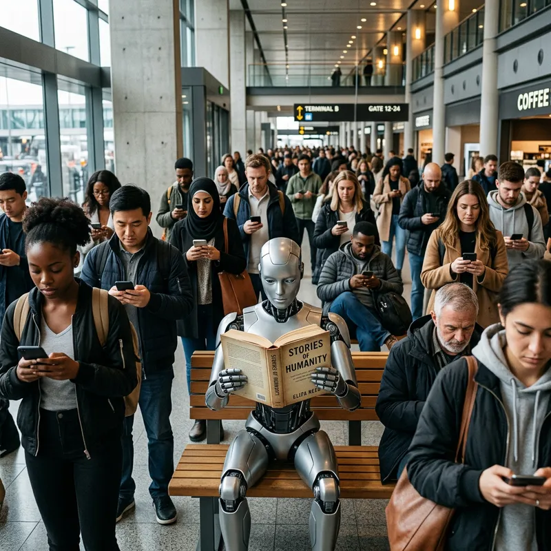 Create a scene in a modern indoor setting which should be filled with people of diverse descents and genders who seem engrossed in their cell phones. In the center of this technology-infused crowd, place a humanoid robot, devoid of identifiable gender. The robot is contrastingly immersed in a physical book. The mood conveyed should be a candid reflection of day-to-day life with a touch of futurism. Give the image a realistic quality, with attention to intricate details like the individual expressions of people and the lighting in the room.
