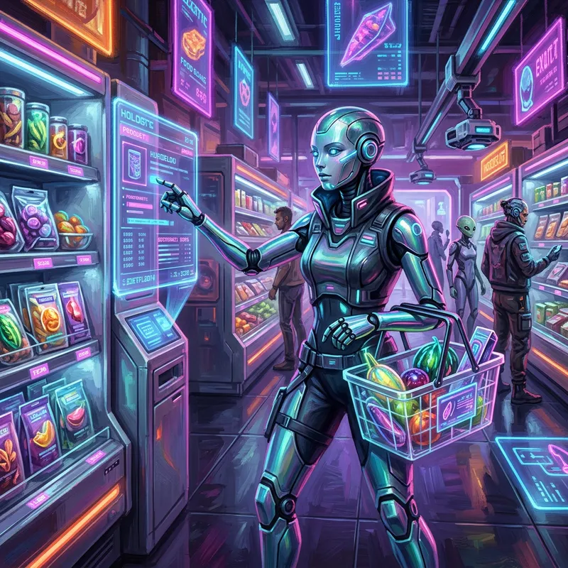futuristic humodeloid creature shopping in a vibrant, high-tech grocery store, in the style of neon colors and sleek, modern design, interacting with holographic displays, dynamic and engaging pose, digital painting with sharp lines and glowing effects, cyberpunk, Oil Painting.