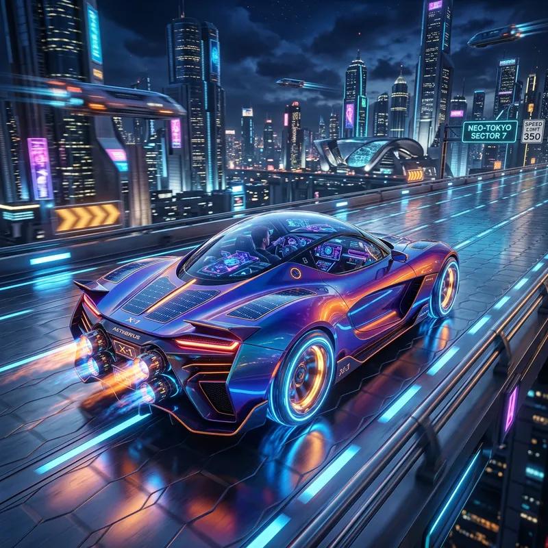 Generate an image of a futuristic, imaginative car that doesn't exist in reality. It could have vibrant colors, be high-tech with sleek lines and innovative features such as holographic controls, floating tires, and a glass dome top. Perhaps also include solar panels and multiple exhaust pipes for a touch of exaggerated, conceptual futurism. The car could be placed on a metallic, glossy road to signify its advanced, out-of-this-world characteristics.