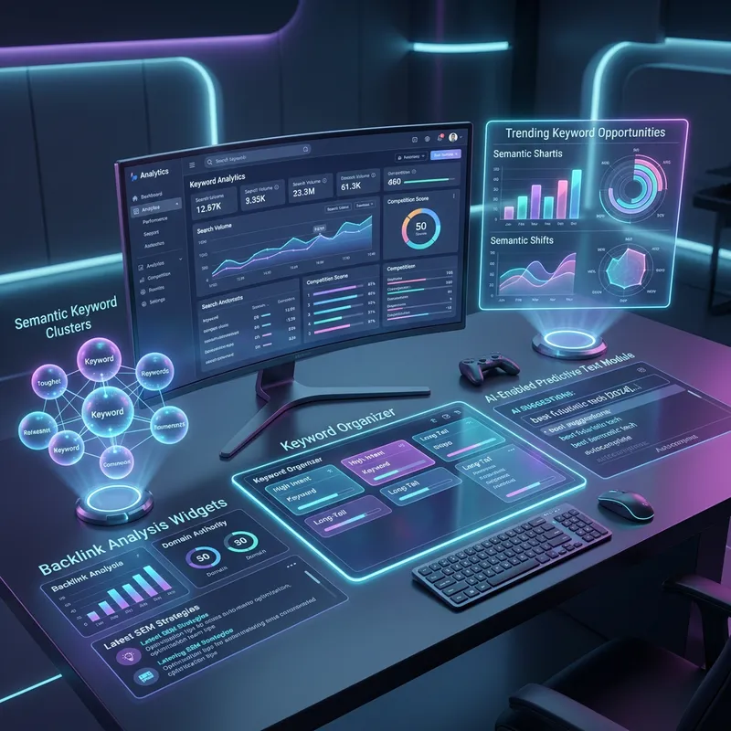 An array of futuristic tools for keyword research in the year 2024. The scene depicts an advanced digital interface with several multimedia and semantic analysis components. It features high-tech software screens showcasing real-time data analytics, HUD (Heads Up Display) with colourful holographic charts and graphs on trending keywords, AI-enabled predictive text module, and a virtual touchscreen keyword-organizer panel. Additionally, there are 3D holographic keyword clusters, backlink analysis widgets, and latest SEM (Search Engine Marketing) strategies on another corner. The overall ambiance is sleek and ultramodern, reflecting the innovation occurring in the SEO (Search Engine Optimization) landscape. The entire setup is bathed under soft neon glow emanating from the digital panels, reinforcing the futuristic theme.