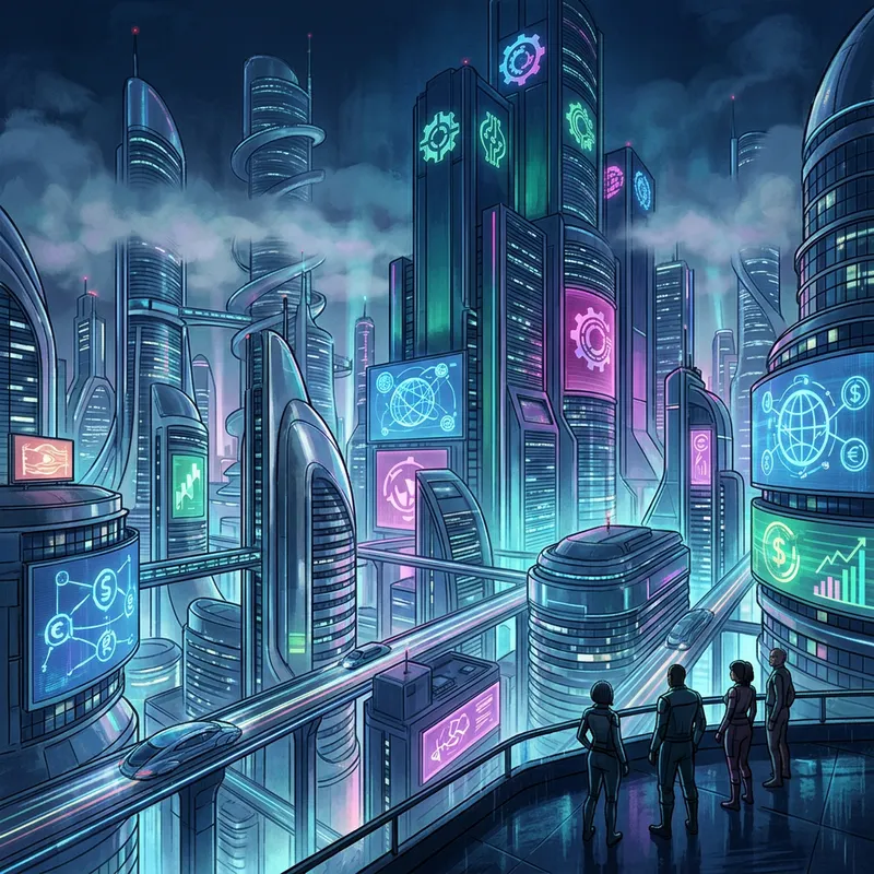 An imaginative digital illustration of a futuristic landscape, inspired by sci-fi genre, where a colossal international corporation governs the destiny of humanity. Gleaming skyscrapers reach the clouds, bathed in neon lights that represent the corporation's power. Massive LCD billboards display abstract symbols of a potential future where commerce and technology intertwine. The architecture follows streamlined, chrome-like aesthetics typical to retro-futurism. Serene silhouettes of diverse individuals observe this dystopian yet captivating view, wondering about their place in this future.