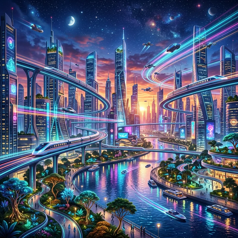 Immerse yourself in an awe-inspiring visualization of a futuristic landscape. Imagine skyscraper-like structures towering towards the ever-changing hues of the sky, silhouetting against a brilliant array of neon lights. High-speed, magnetically levitated bullet trains darting across on intertwining, curvaceous tracks suspended mid-air. Flying autonomous cars zipping around in a meticulously organized traffic flow, leaving behind trails of iridescent light. Celestial bodies even visible from this distanced spectacle, illuminating the sky further. Greenery interspersed in between, with exotic, genetically engineered trees that glow subtly, illuminating walkways. A pristine, rivers winding lazily through the urban sprawl, reflecting this high-tech utopia on its shimmering surface.
