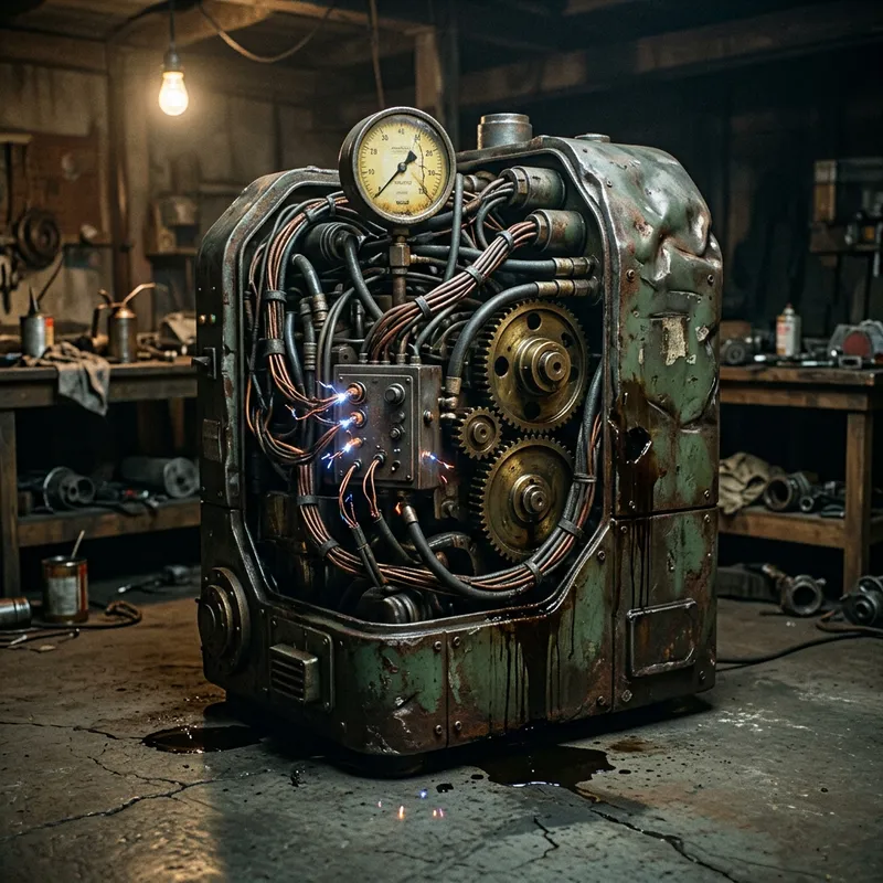 Picture a futuristic yet aged machine in a dimly lit workshop. The machine has complex interwoven wires and gears, with rust accumulated on its metallic surface indicating years of use. It's clear that this machine has been through a lot. A subtle sign of 'suffering' is portrayed through sparking wires and worn out parts, giving an air of malfunction and distress. Pools of oil under the machine suggest that it is leaking fluid, a sure sign of wear and tear. The scene gives an overall sense of hardship endured by this inanimate object but also demonstrates the resilience of its design.