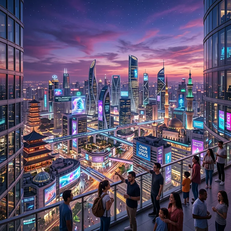 A futuristic metropolis that is the epitome of a property metaverse. Imagine a sprawling cityscape view that shows a vast and intricate network of interconnected digital properties. Architectural styles should be a conceptually various mix, representing a global influence, and incorporating both futuristic hyper-modern designs and reinterpreted traditional structures. Digital displays or holographic elements should be prominent, indicating the city's advanced technological infrastructure. People of diverse ethnicities, genders and ages should be visible, illustrating the city's diversity and vibrant atmosphere. It’s dusk, and the metropolis glimmers with the glow of thousands of neon signs and digital billboards. The sky above is a blanket of purple and pink hues with a few first stars popping out. This spectacular view is captured from the vantage point of a high-rise building, offering a sweeping, panoramic view of the digital property metaverse.