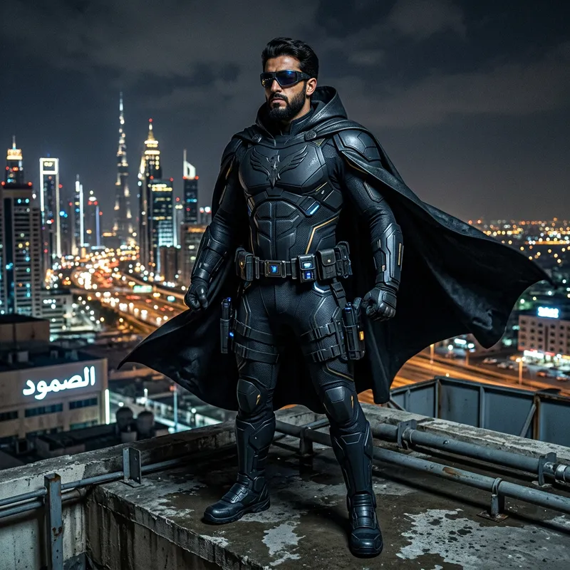 Imagine a middle-eastern male superhero, cloaked in a futuristic and sleek attire of dark hues. He is striking a defiant and resistant stance, equipped with a tactical utility belt around his waist, and a pair of shadowy tinted visors shielding his eyes. His formidable presence is accentuated by a distinct aura of heroism and unwavering firmness.