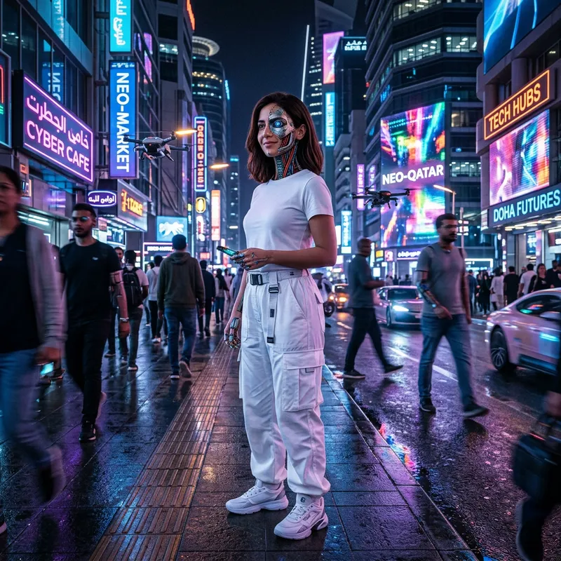 Create a futuristic image of a confident 24-year-old Middle-Eastern woman, with shoulder-length brown hair and brown eyes. She's beautiful with visible robot features - half her face shows wiring. Her attire consists of a white t-shirt and loose white pants. Neon colors give her a surreal yet realistic look. Illustrate her from a far angle to encompass her full outfit and the surroundings. She is standing on a busy street with her left profile dominant in the scene. Provide a good balance between the realistic and robotic elements of her facial features.