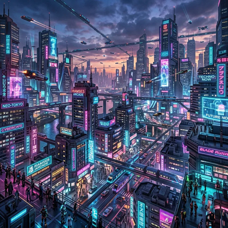 Visualize a futuristic cityscape during the hours of dusk. The metropolis is illuminated by vibrant neon lights which give life to the city. The city is bustling with life, hinting at a rich veins of urban energy that course through it. The architecture is highly advanced, reflective of a cutting-edge era. A wide-angle perspective provides a sweeping view of the city, emphasizing the magnitude of its area. Imbibe inspiration from art styles seen in the cyberpunk genre. The medium used is futuristic digital art.