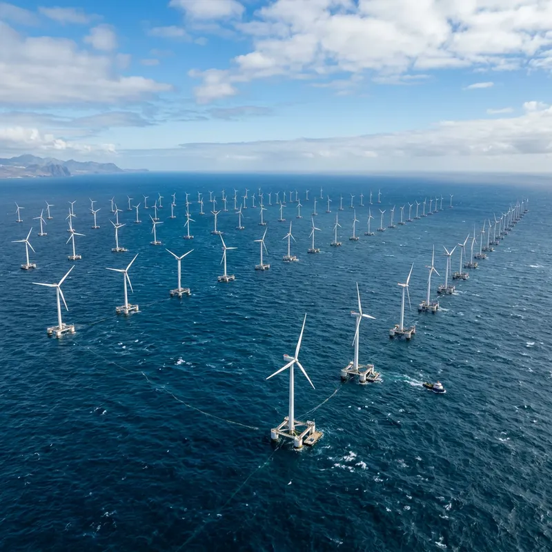 Imagine a futuristic and minimalistic offshore wind power plant situated in the deep blue ocean. It's captured from a bird's-eye view with a drone, utilizing a wide-angle lens to exhibit the expansive scene. The powerful wind turbines are scattered across the horizon, highlighting the scale and effectiveness of renewable energy sources. This high-quality 4k resolution image encapsulates the essence of an environmental documentary, promoting the importance of sustainable practices.