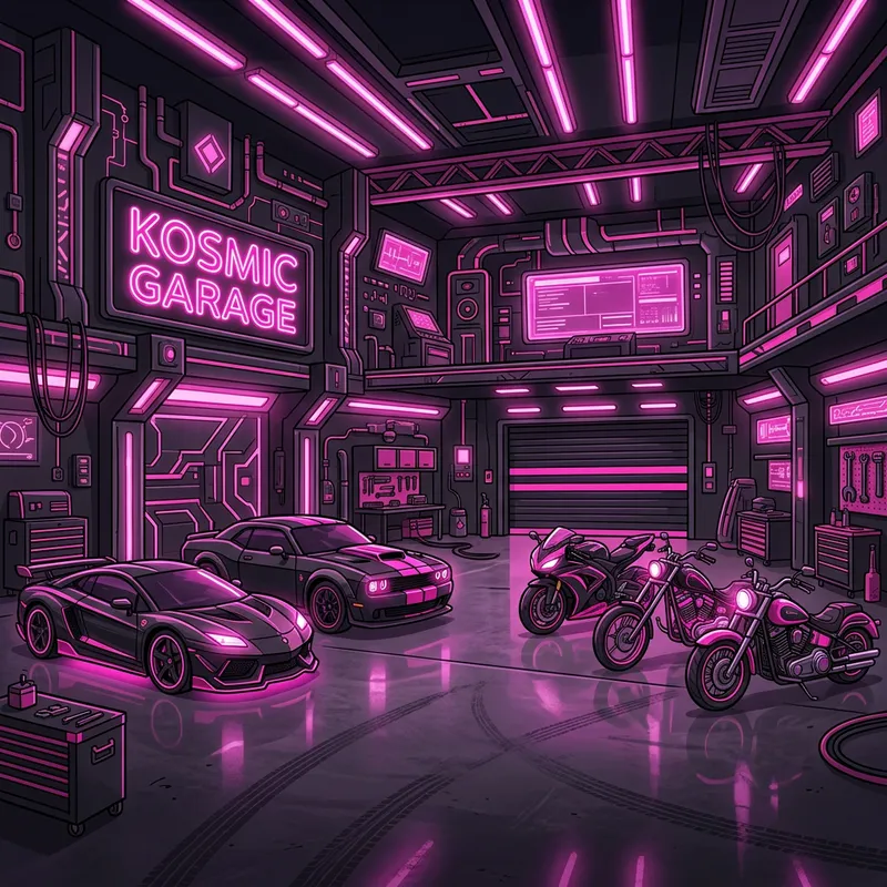Imagine a background setting that replicates a garage. The garage has ample empty space, bathed in the gleam of pink neon lights. The walls are sternly solid, painted in a sleek black shade with an infusion of futuristic style elements. Parked in this garage are motorcycles and cars, coming to life in an array of primarily pink and black hues. The entire setting, vehicles included, is depicted in a 2-dimensional animated cartoon style, giving it a playful aesthetic. The pink lights add to the overall ambience, casting an almost futuristic glow.