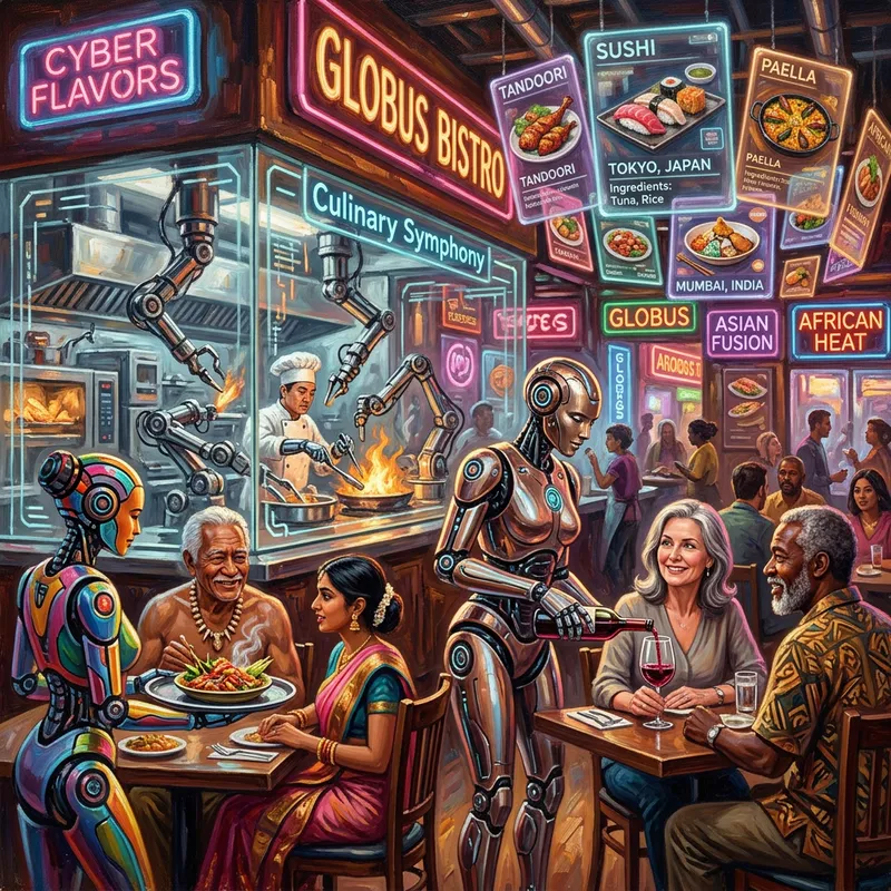 An oil painting captures a futuristic, diversity-rich restaurant glowing with neon lights. Illuminated holographic menus fill the air, detailing varied worldwide dishes. A metallic, humanoid robot pours wine for a middle-aged Caucasian woman, her African companion intrigued by the AI-driven service. On the painting's left, a Latinx robotic waitress serves an exotic dish to an elderly Pacific Islander man and a younger South Asian woman. Augmented reality overlays educate diners on visited culinary locations and dish ingredients. Behind a transparent partition, a robotic chef's intricate arms precisely orchestrate a culinary symphony. Warm hues dominate, evoking comfort amidst advanced technology. This visual narrative symbolically marries tradition and innovation.