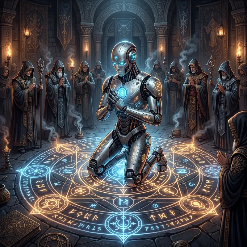 An illustration of a futuristic machine with metallic surface, sense of artificial intelligence, and robotic limbs participating in a sacred ceremony. The robot is depicted in the center of a circle, surrounded by intricate designs common in ritual practices. There are various mysterious symbols and patterns on the ground around the robot, glowing with an ethereal light. The atmosphere of the scene is somber yet serene, hinting at the profoundness of the ritual taking place.