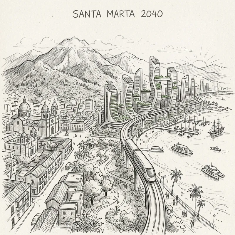 Depict a simplistic pencil sketch of the city of Santa Marta in the year 2040. The cityscape should include futuristic buildings, advanced transportation systems, and lush green parks, while still preserving the historical and cultural aspects of the city.