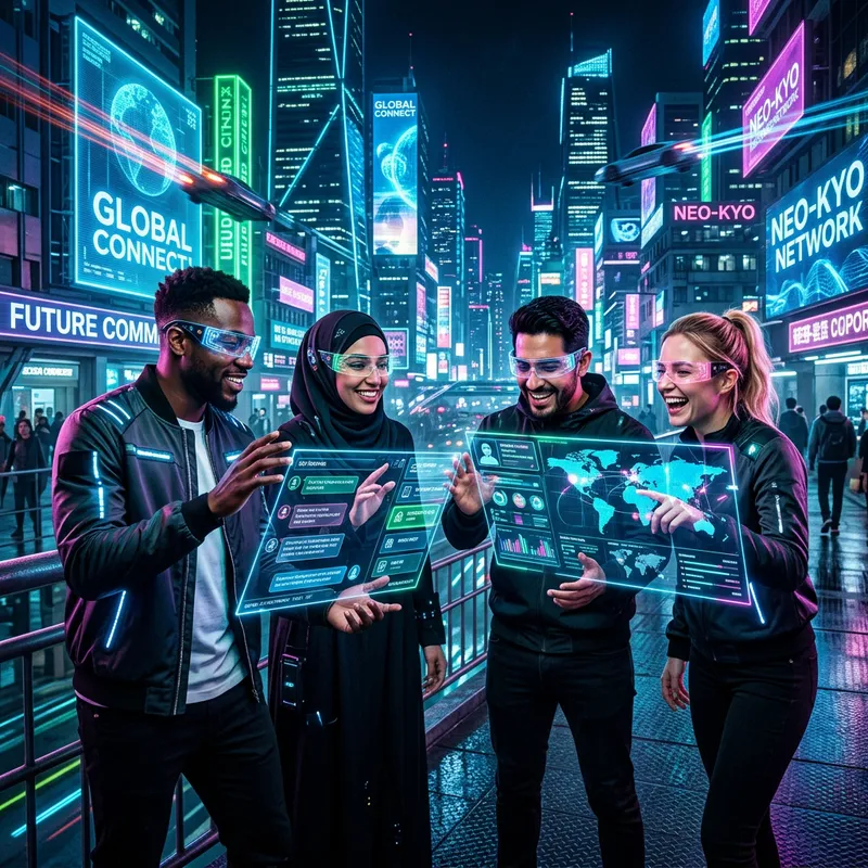 Create a futuristic sci-fi image depicting the influence of technology on communication. Show a group of individuals of diverse descents like a Black man, a Middle Eastern woman, a Hispanic man and a Caucasian woman all sporting state-of-the-art augmented reality glasses. They interact with holographic displays, which project real-time messages and data. Illuminate the scene with neon cyberpunk style lighting, filled with vibrant hues of electric blue and neon green. Capture the dynamic movements of these characters to emphasize their enthusiasm and interaction. Mimic the perspective of a high-resolution mirrorless camera using a wide-angle lens to take in the entirety of this extensive, futuristic setting. This image should reflect the crossroad of technology and communication, underlining the progress and trials of a digitally interconnected world.