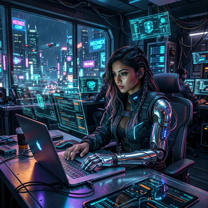 An attractive South Asian woman in futuristic, cyberpunk attire working diligently on a sleek, metallic laptop in an office setting filled with neon lights and high-tech equipment. The room has an ambiance of lucid colors reflected on the shiny surface of the laptop, the chrome finish of her augmented arm gleaming subtly under the glimmering illumination. Holographic screens with complex interfaces float around her, revealing the complex nature of her work.