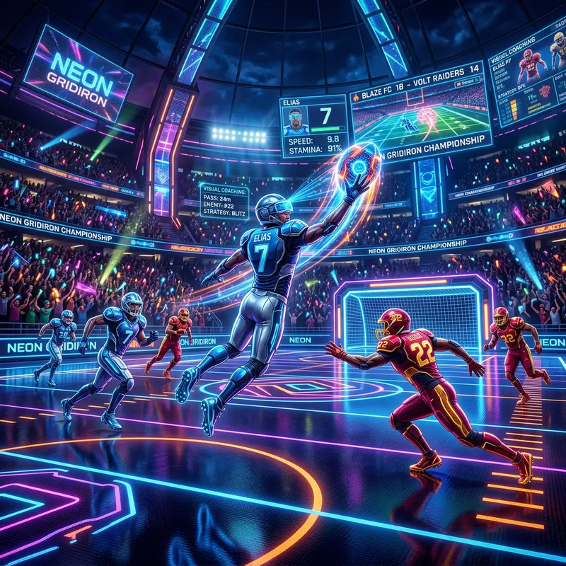 Imagine a futuristic scenario, where sports are taking place in an advanced and high-tech setting. The field is made of illuminated neon lines, with large screens displaying scores and player statistics. Players wear sleek, form-fitting uniforms equipped with sensors and augmented reality goggles that provide real-time visual coaching and strategies. The ball they play with is also of an innovative design, perhaps glowing with internal light or moving in unpredictable ways thanks to built-in microprocessors. There is a prevailing sense of energy and excitement emanating from the ongoing game.