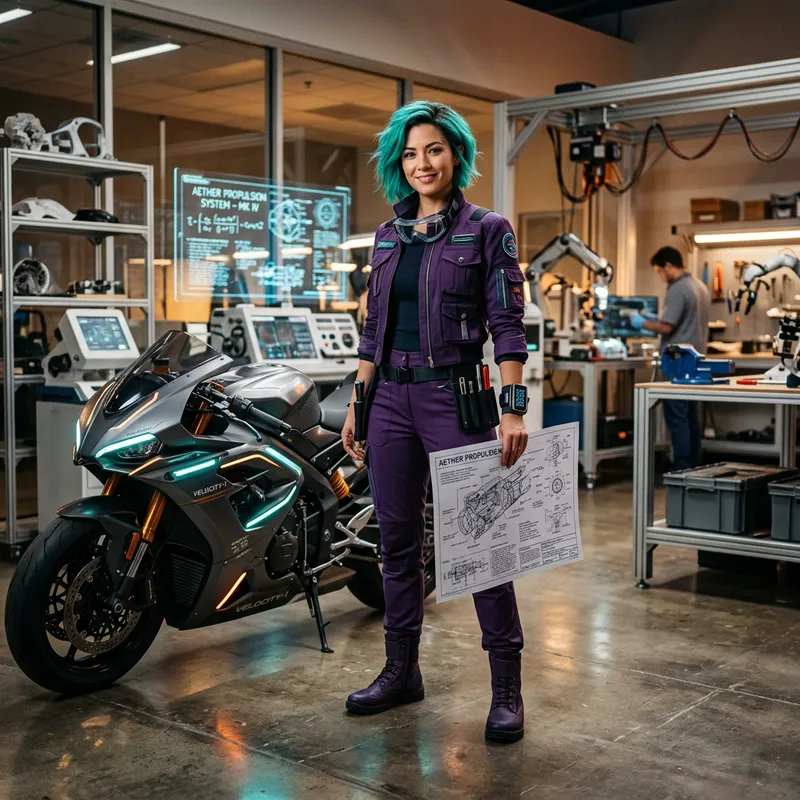Generate an image of a brilliant scientist with teal-colored hair, dressed in a purple outfit. She is known for her inventiveness and resilience. She is standing in front of a futuristic motorcycle, holding a blueprint of her next invention. The setting is a high-tech lab filled with various machinery and innovative technology. No distinctive facial or body features should indicate a specific fictional character.