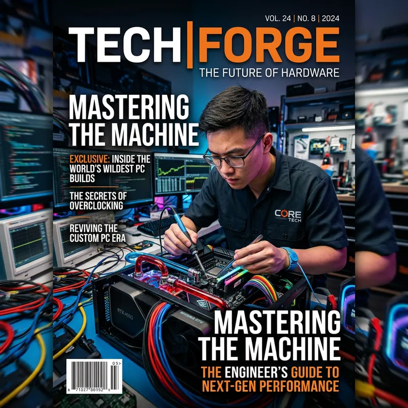 a engineer who are familiar with PC, styled after a modern tech magazine cover, dynamic angles, focused expressions, creative chaos, Canon EOS R5, studio lighting setup, futuristic tech vibes