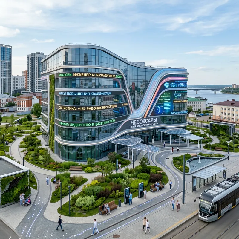 Imagine a futuristic version of an unemployment center in the city of Cheboksary. Picture a building that perfectly blends into the modern urban fabric - its architecture reflecting an advanced, high-tech design. Its facade could be composed of sleek, shining materials, perhaps with interactive panels displaying job opportunities, upcoming workshops, or helpful statistics. The landscape around the center is manicured and complemented by green-tech systems, integrating the building into the eco-conscious future. To ensure realism, imagine the environment under the subtle hue of a typical day in Cheboksary.
