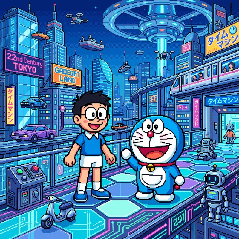 Display an image of two iconic cartoon characters: one is a young boy with black hair and glasses, dressed in a blue shirt and white shorts, and the other is a robotic cat-like creature of a vivid blue color with a pouch around its waist. Both characters reside in a futuristic world filled with amazing gadgets. The image should be styled in pixel art.