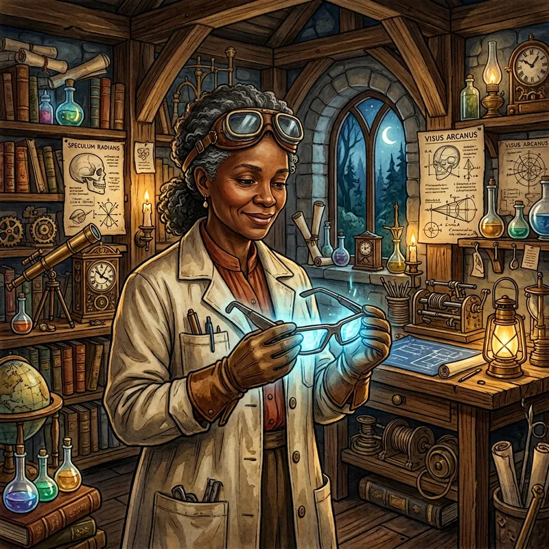 Depict a fantastical representation of a scientist's laboratory. In the foreground, let there be a distinguished inventor, a Black woman, in a tidy lab coat, protective goggles on her forehead, and gloves. She cradles a cutting-edge device: an eyeglass with a sleek design and a hint of a futuristic aura. The eyeglass emanates a faintly radiant, blue glow, suggesting the amplifying power of x-ray vision. Behind the scientist, various tools, diagrams, and devices scatter, symbolizing her relentless pursuit of innovation. Brothers Grimm's style, the room should appear cozy and nostalgic while the invention symbolizes a step into the future.