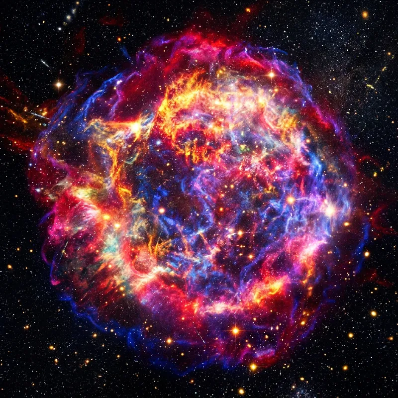 Imagine the stunning spectacle of a cosmic galactic explosion, teeming with a kaleidoscope of colours. This magnificent scene unfolds across a vast expanse of the cosmos, engulfing stars and celestial bodies in its path. Think of the grandeur of interstellar gas clouds ignited by this cataclysm, resulting in brilliant hues of blues, reds, purples, and yellows folded into one another. Faint streaks of starlight pierce through the explosive chaos, creating a wondrous contrast against the darkness of space. This is an abstract depiction with no concrete shapes, just the raw, untamed beauty of the cosmos in upheaval.