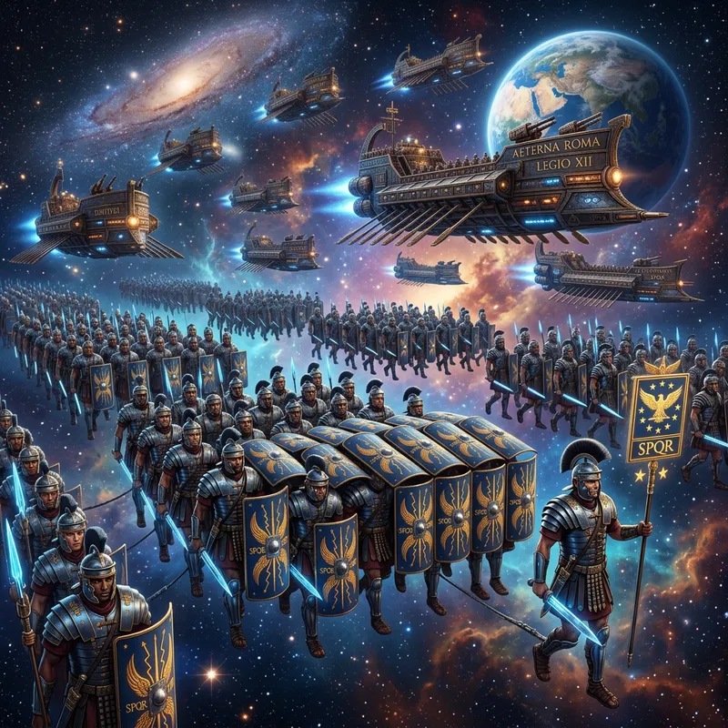 A magnificent sight of the Galactic Roman Army set against the backdrop of outer space. These are men and women from different descents including South Asian, Hispanic, Black, White and Middle-Eastern, all clad in a space-age interpretation of traditional Roman military attire, distinguishable by their segmented plate armor and iconic helmets. Each soldier is equipped with advanced technology weapons, a futuristic twist on the Roman pilum and gladius. They are in various formations, floating against a backdrop of distant stars and galaxies. A grand celestial fleet of space galleons, reminiscent of Roman warships, accompanies them.
