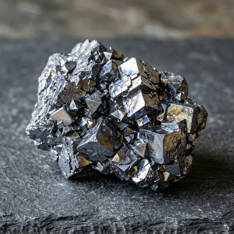 A close-up image showcasing the intricate details of a Galena specimen, commonly known as lead zinc ore. The metallic luster of the mineral is beautifully contrasted with sporadic growth of cubic and octahedral crystals that reflect a multitude of colors when hit by light. The specimen sits on a flat, dull, grey slate to enhance the vibrancy and unique allure of the Galena. The edges of the Galena appear sharp and pointed, adding a sense of raw, untamed beauty that is inherent in nature's creations.