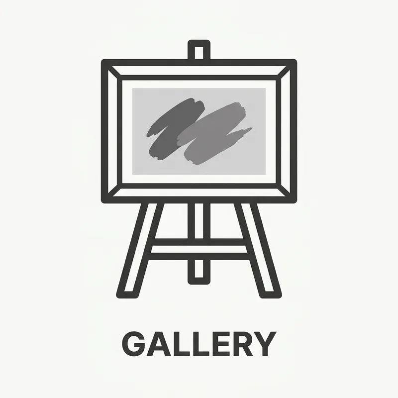 Design an icon symbolic of a gallery. The icon should be simple and easily identifiable with universal visual attributes connected to a gallery, like a painting easel or a collection of framed pictures. The icon should be crafted in a neutral colour palette to ensure it fits in with various website designs, while still maintaining its clarity and legibility when reduced to small dimensions for use in HTML coding.