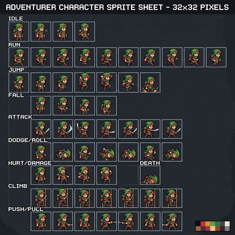 Game sprite sheet with animation frames and character poses, pixel art or 2D game asset collection showing movement cycles, organized sprite layout for game development, retro gaming graphics perfect for indie games and platformers.