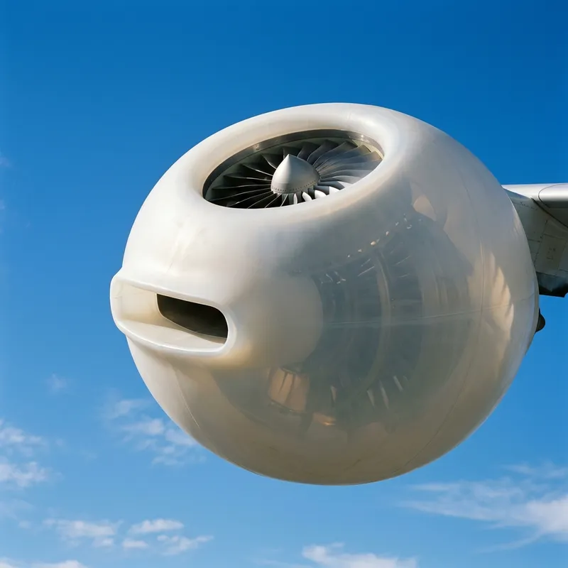 Visualize a side view of a large airplane engine, resembling a General Electric GE9X model, soaring through a crystal blue sky. The powerful fan, the heart of the engine, is situated atop and slightly recessed within a casing. This peculiar casing takes the form of a matte white, translucent rubber ball, distinguished by its wide, flat air intake positioned on one side. The aerodynamic prowess of the engine and the sheer majesty of the device in flight are accentuated by the pristine sky backdrop.