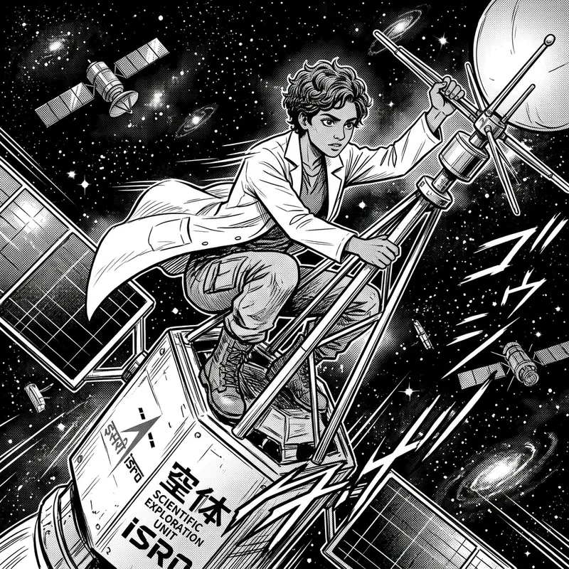 A South Asian gender-neutral researcher wearing a white lab coat is adventurously riding on a large satellite that is navigating through the vast expanse of space. The entire scene is depicted in a graphic, black-and-white, dramatic style characteristic of traditional Japanese comic books or Manga. The background features an endless dark void dotted with distant stars and galaxies, adding a sense of depth and infinite exploration. The researcher appears focused and determined, reflecting their commitment to scientific discovery despite the challenging environment.