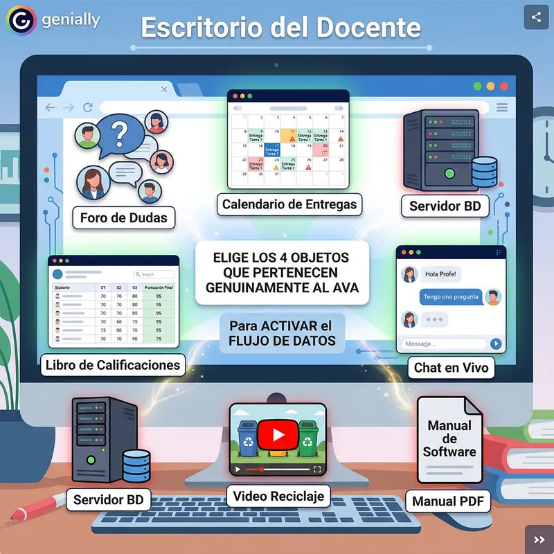 Generate images of what I explain. In Genially, the "Teacher's Desk" will present various disorganized objects. The user must select only 4 objects that genuinely belong to the Virtual Classroom Ecosystem (A.V.A.) to "activate" the flow of data.