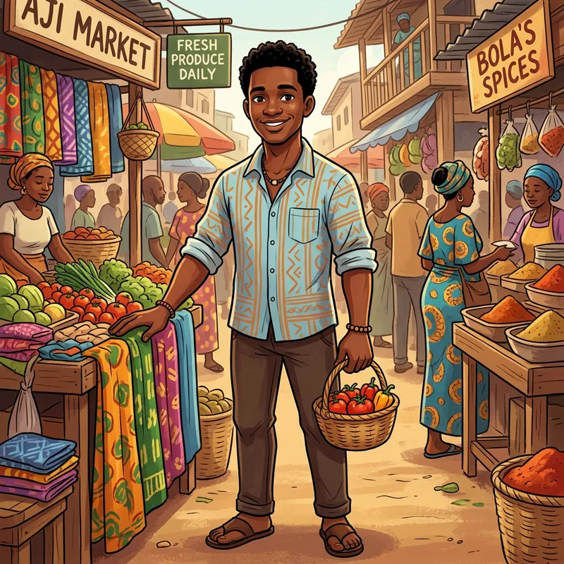 Generate a cartoon picture of A handsome young Nigerian man with brown skin and short curly hair. He has kind eyes, a gentle smile, and wears a simple shirt and trousers, often with rolled sleeves from working with his hand in a busy market background. He's humble but strong in spirit. Cartoon art style.