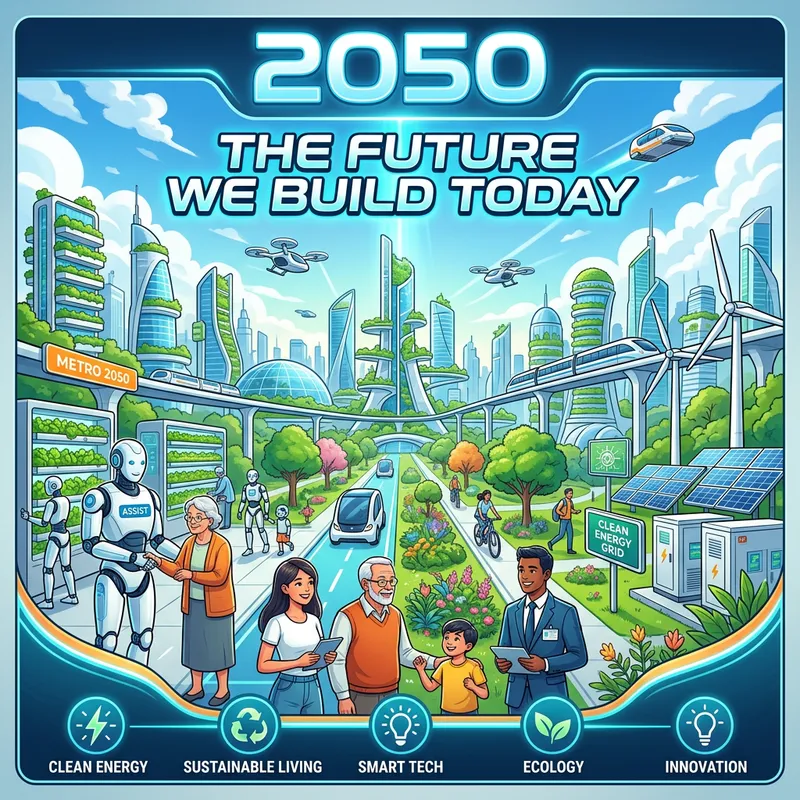 Generate a digital artwork or poster showcasing the theme of 2050 'future' — like futuristic cities, clean energy, robots helping people, green environment. Neat and organized the layout. Slogan catchy the positive '2050: The Future We Build Today'.