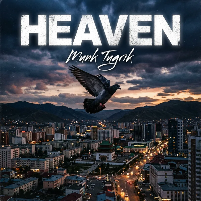 Generate a drill hiphop music cover photo of a pigeon flying over the city of Ulaanbaatar with the big title of HEAVEN written in the sky and the artist name of Munk Tugrik in smaller size shown in italics right under the title.