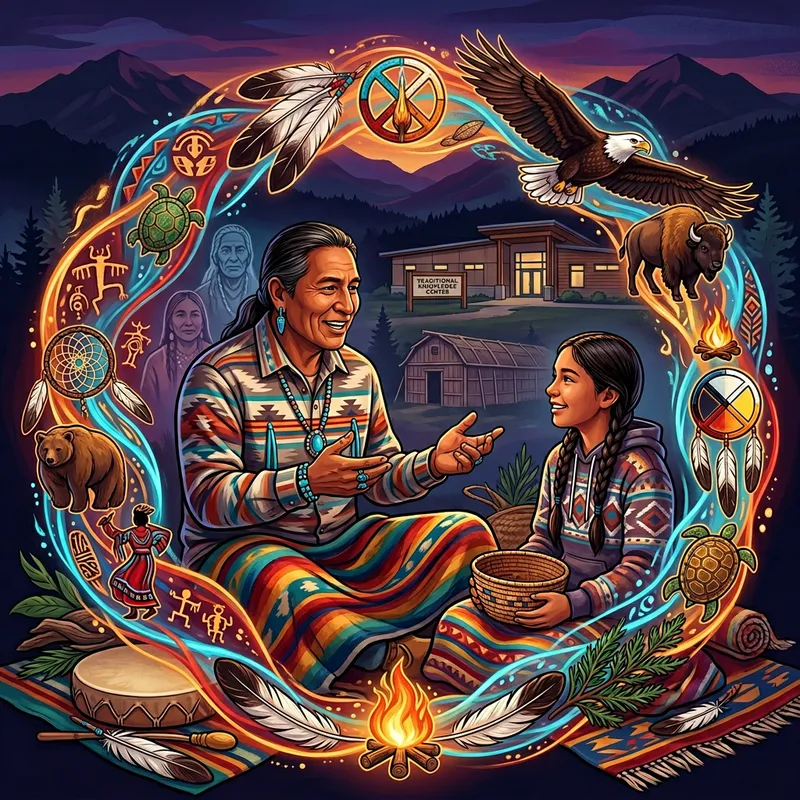 Generate a highly detailed and realistic digital painting style vector illustration that showcases a modern day native American adult speaking with a younger person , encircled by a variety of vibrant colors and imagery that depicts sharing cultural knowledge. The background contains deep rich colors vividly emphasizing the interconnection of the past and the present.