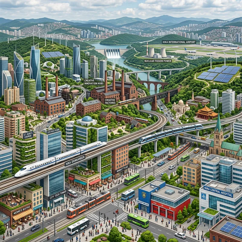 Generate a picture of a high-tech green designed city which still has the coal era remnants mixed with cutting edge technology containing both modern and futuristic tones from urban sprawl to downcore with bustling streets, walkability, transit systems (trains, monorails ,subways, buses, airports, even a bullet train) medical centers, police and fire as well as all basic needs. Businesses, restaurants and the basic needs of any huge growing city. Adding in trees, high-tech solar and wind ideas of the future plus dams, nuclear fission and more. All built on rolling hills. population plan is about 25 million people. And should be very diverse with all cultural differences respected. Plus churches, schools and more.