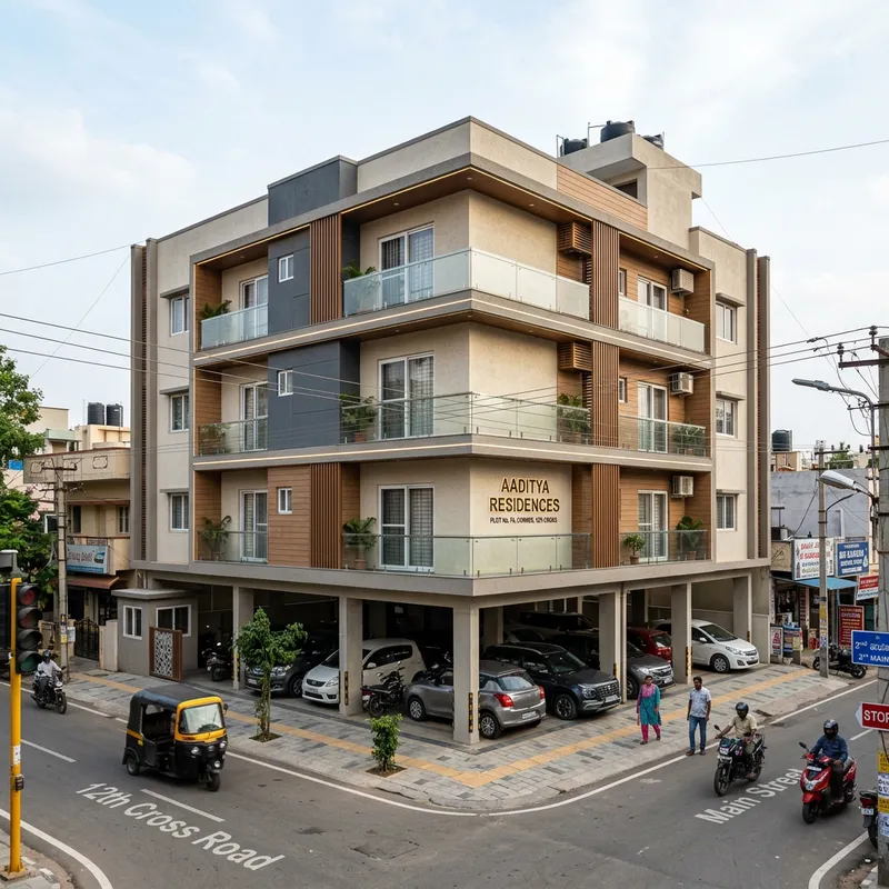 Generate an image of a house facade located at corner of road. this is stilt parking with four storey residential building in urban contemporary style as per indian building standards.