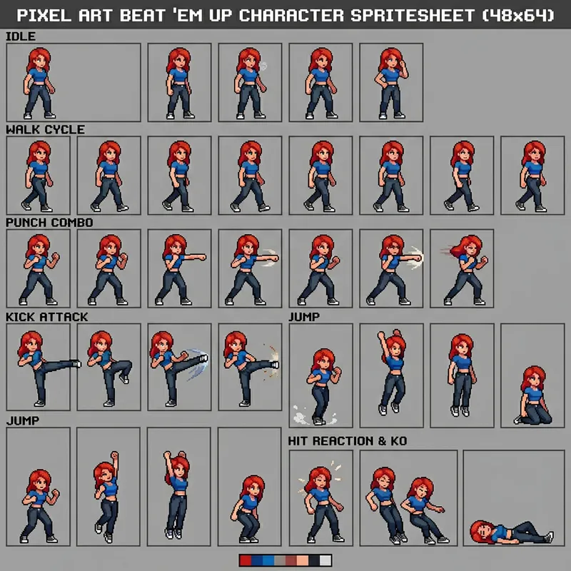 Generate pixel art animation sequences for a beat ’em up video game character based on the reference image provided 48x64 pixels.