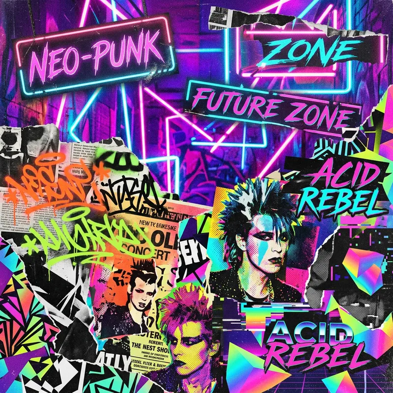 Generate an abstract artistic neopunk 80's image with a colorful background featuring neon effects and collages of different contemporary art styles.
